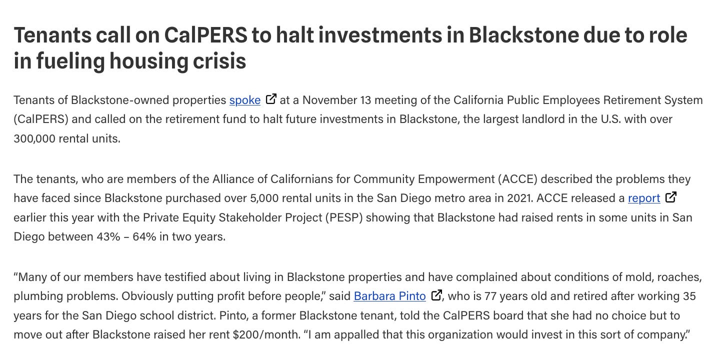 It's a sickening cycle: Blackstone buys up apartments, hikes up rents, and evicts tenants, all while raking in billions from public pension funds like CalPERS. Meanwhile, the very public employees whose pensions are invested in Blackstone struggle to keep a roof over their heads.