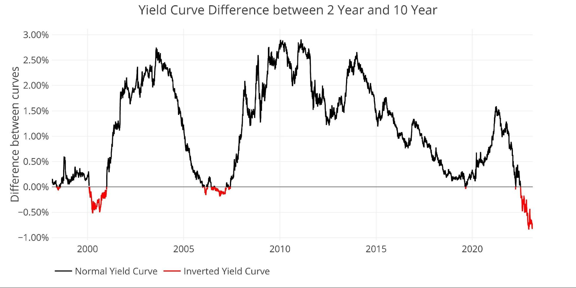The yield curve inversion between 10 and 2-year notes reached -83bps on Feb 14th, matching the low seen back on December 7th.