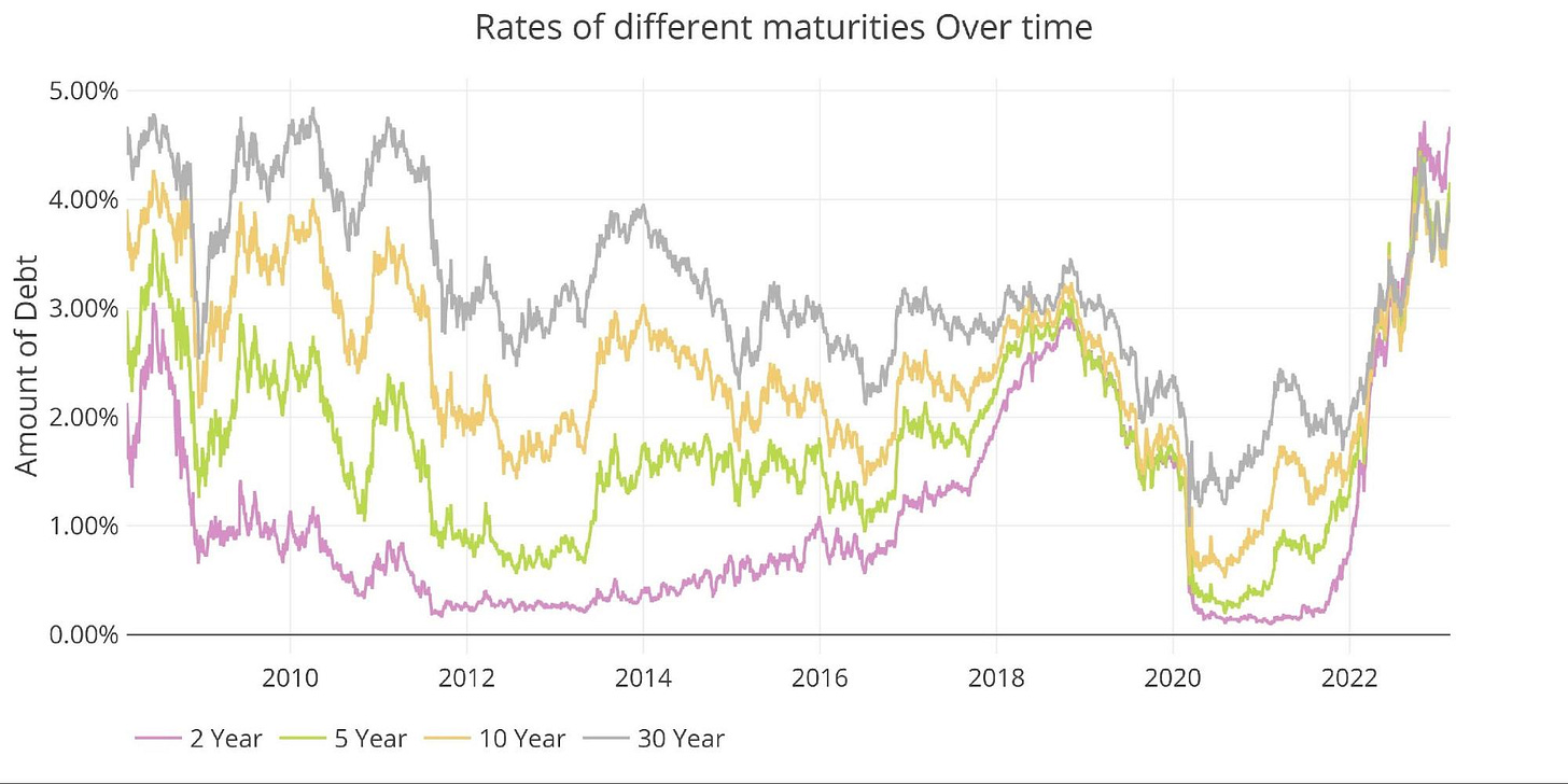Operation Twist would seem unnecessary given the inversion in the yield curve. Then again, the entire yield curve has become a jumbled mess, so maybe the Fed just doesn’t know what to do at this point. The recent spike in yields has brought the 10-year back towards 4% while the 2-year approaches 4.7%.