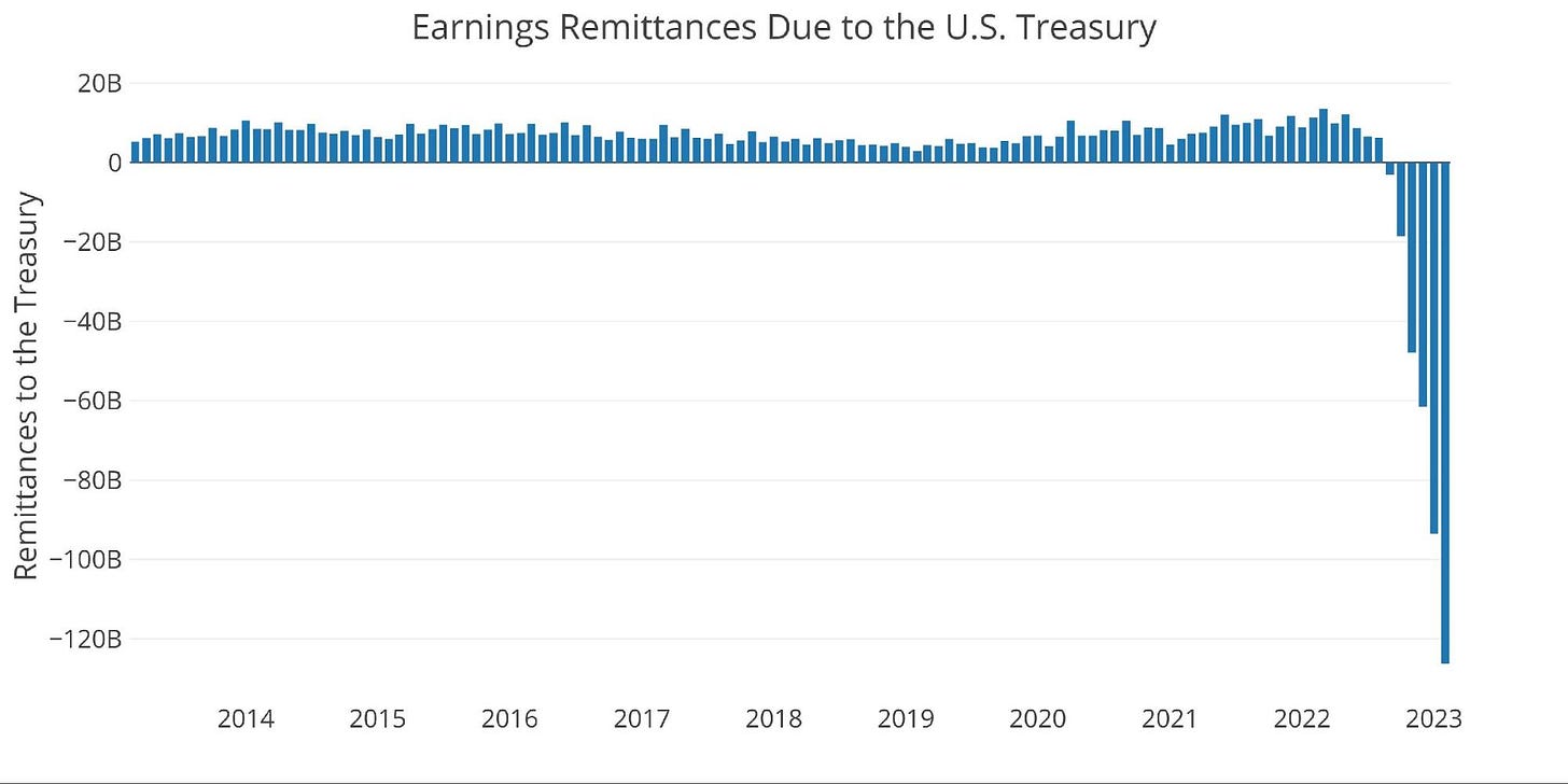 According to Reuters, the Fed has been warning about this possibility for some time. That doesn’t change that these are massive losses! It should be noted, the Fed will not send the Treasury a bill to cover its losses. Instead, it will book the losses into a deficit account that will be held until the Fed makes enough money to make up for its losses.