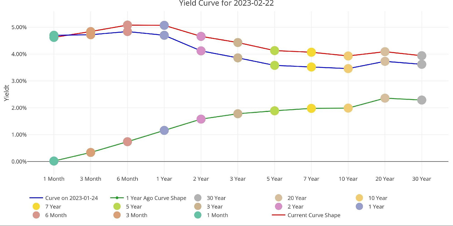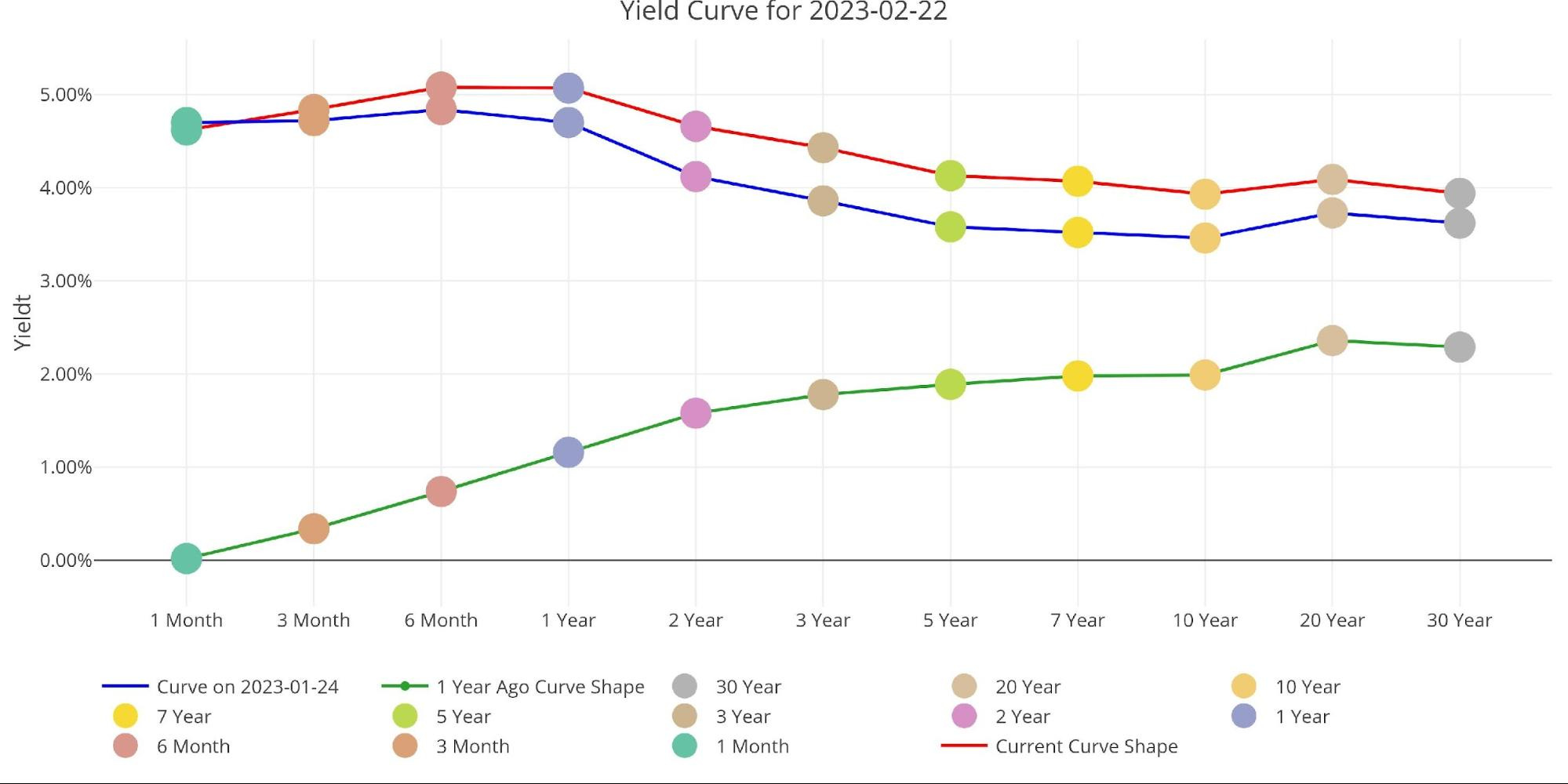 The chart below shows how the yield curve has moved up over the last month. The curve compared to 1 year ago is quite dramatic!