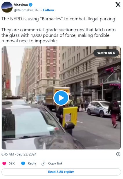 Sharing is Caring! The NYPD is using “Barnacles” to combat illegal parking. They are commercial-grade suction cups that latch onto the glass with 1,000 pounds of force, making forcible removal next
