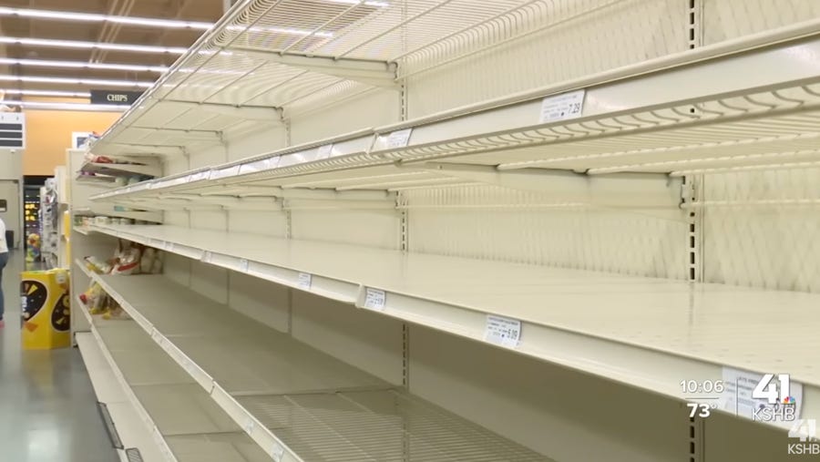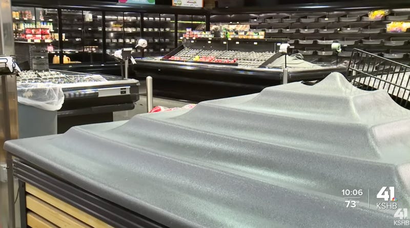 KSHB 41's Alyssa Jackson reported that her news team received a tip from a viewer about empty shelves throughout the dairy section, meat department, bakery aisle, and deli counter.