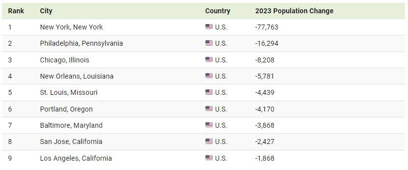 In terms of the highest population loss, major U.S. cities like New York, Chicago, Portland, Los Angeles, and Philadelphia, all experienced significant population decreases in 2023.