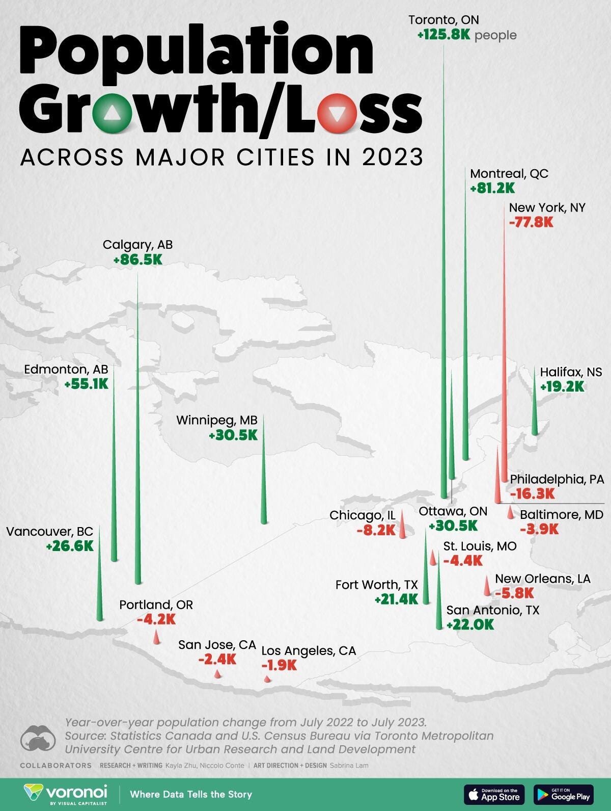 This map, via Visual Capitalist's Kayla Zhu, visualizes the population change of the central cities (i.e. not including suburbs) in Canada and the U.S. that saw the greatest increases and decreases in population in 2023.
