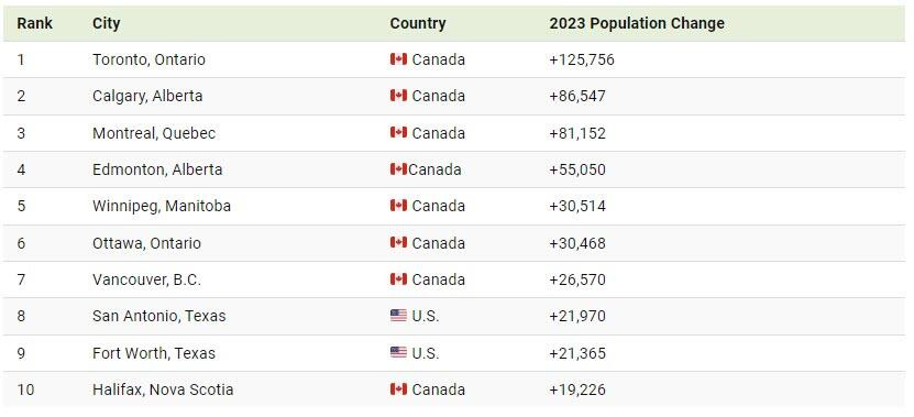 Eight of the top 10 fastest-growing cities were in Canada. Only two U.S. cities in Texas, Fort Worth and San Antonio, made the top 10.