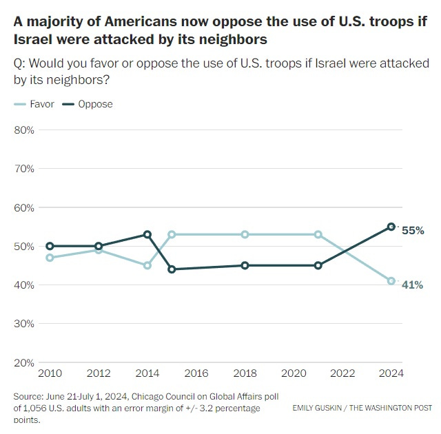 A poll from the Chicago Council on Global Affairs released last month found the majority of Americans (56%) oppose sending US troops to defend Israel -- yet it's had zero effect on our foreign policy.