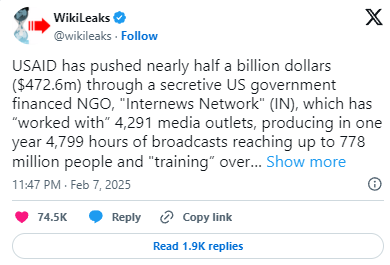 USAID has pushed nearly half a billion dollars ($472.6m) through a secretive US government financed NGO, "Internews Network" (IN), which has "worked with" 4,291 media outlets, producing in one year 4,799 hours of broadcasts reaching up to 778 million people and "training" over 9000 journalists (2023 figures). IN has also supported social media censorship initiatives.