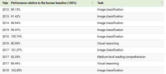 Below, we show how AI models have performed relative to the human baseline in various technical tasks in recent years.