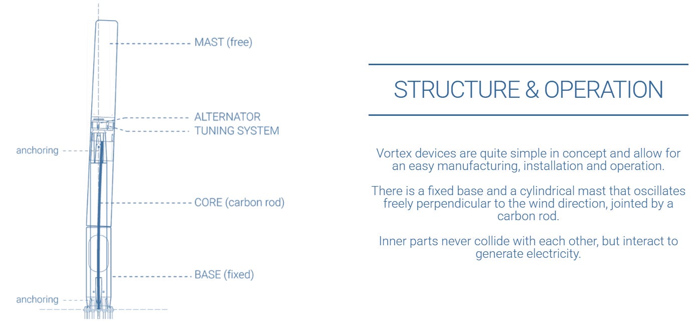 Uses carbon fiber and fiberglass for oscillation, with a magnetic tuning system to optimize resonance, per Vortex Bladeless.