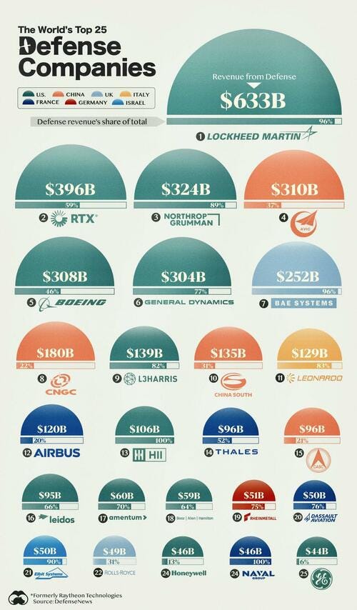 CompanyRevenues from Defense (USD billions)Defense share of total revenue (%)🇺🇸 Lockheed Martin$63396%🇺🇸 RTX Corp (formerly Raytheon Technologies)$39659%🇺🇸 Northrop Grumman$32489%🇨🇳 Aviation Industry Corporation of China$31037%🇺🇸 Boeing$30846%🇺🇸 General Dynamics$30477%🇬🇧 BAE Systems$25296%🇨🇳 China North Industries Group$18022%🇺🇸 L3Harris Technologies$13982%🇨🇳 China South Industries Group$13531%🇮🇹 Leonardo$12983%🇳🇱/🇫🇷 Airbus$12020%🇺🇸 HII$106100%🇫🇷 Thales$9652%🇨🇳 China Aerospace Science and Technology Corporation$9621%🇺🇸 Leidos$9566%🇺🇸 Amentum$6070%🇺🇸 Booz Allen Hamilton$5964%🇩🇪 Rheinmetall AG$5175%🇫🇷 Dassault Aviation$5076%🇮🇱 Elbit Systems$5090%🇬🇧 Rolls-Royce$4931%🇺🇸 Honeywell$4613%🇫🇷 Naval Group$46100%🇺🇸 General Electric$446%