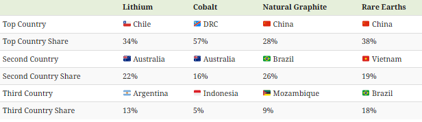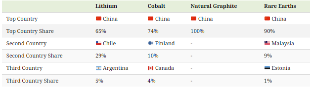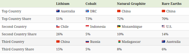 For lithium, the top-producing country is Australia (51%) and for cobalt it is the Democratic Republic of Congo (73%). Meanwhile, China produces the highest share of both natural graphite (72%) and rare earths (70%).