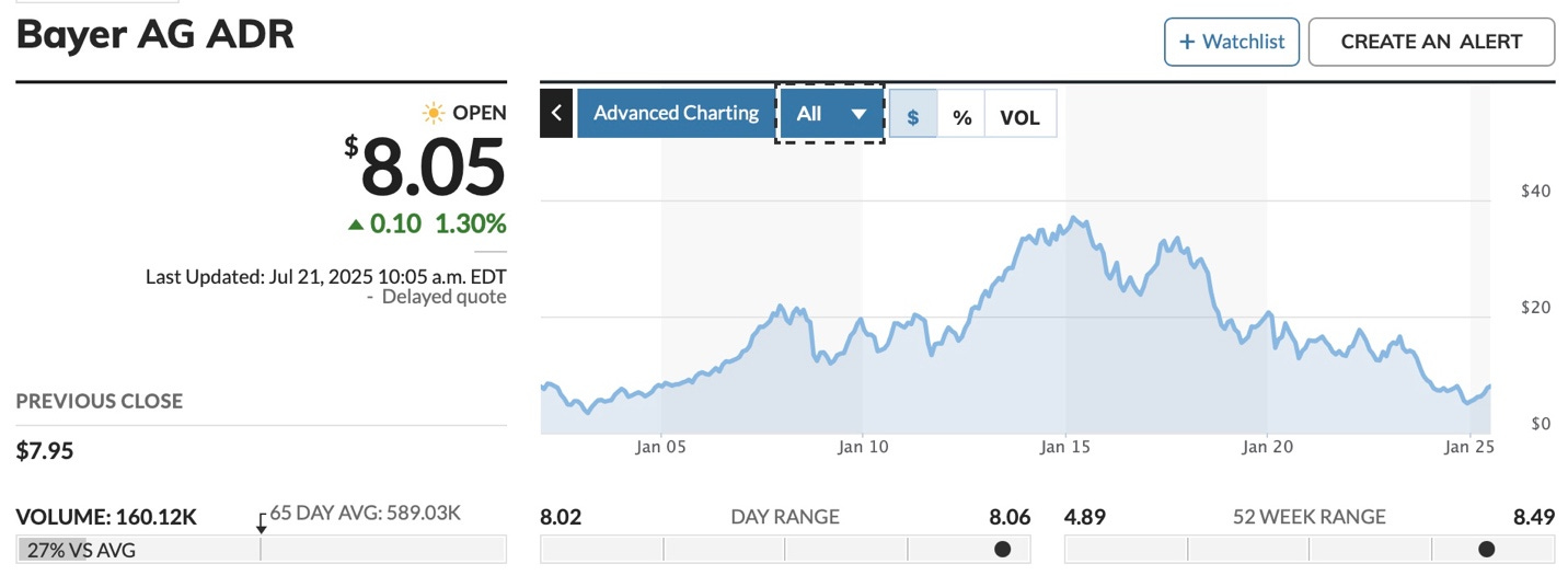 Bayer's stock has been dropping ever since it bought Monsanto. Eventually, about 177,000 potential lawsuits appeared. About 67,000 thousand have settled, at a cost to Bayer of $11 Billion dollars. Bayer's current share price is $8.05, less than a third of its value before the Monsanto purchase.