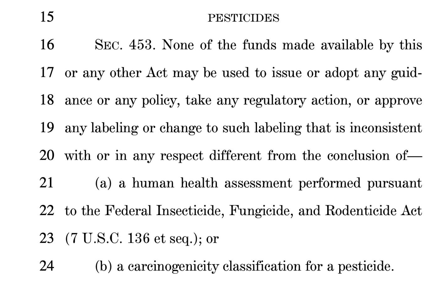 If passed, Section 453 will restrict the ability of pesticide companies to update warning labels on their products — even when evidence shows risks — unless the Environmental Protection Agency (EPA) undertakes a new full review of the chemical under Federal Insecticide, Fungicide, and Rodenticide Act (FIFRA), or makes a new carcinogenicity classification of it. Either of these options will take years, leaving millions of unaware Americans potential victims of their known risks.
