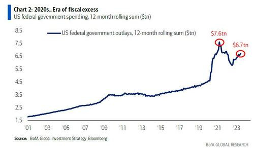 ... but in this case a surge in debt issuance meant to sustain the illusion of the deficit-busting Bidenomics, which has managed to keep the US economy from imploding only thanks to massive new debt and deficit spending, or what BofA's Michael Hartnett called "The Era Of Fiscal Excess", something which Fitch finally realized last on Tuesday when it became only the second rating agency in history to downgrade the US AAA rating.
